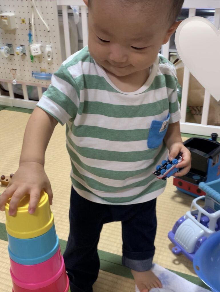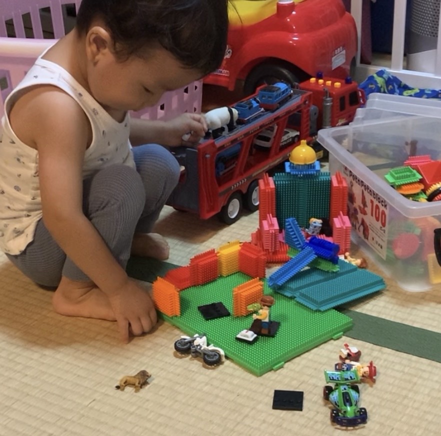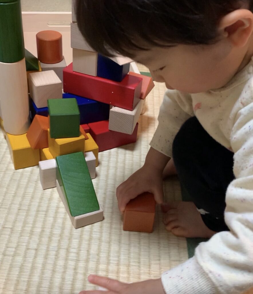 子どもは、「これはバス」「これはおうち」と、少しずつ見立て遊びが始まりました。 この瞬間、子どもの世界が少し広がったように感じました。